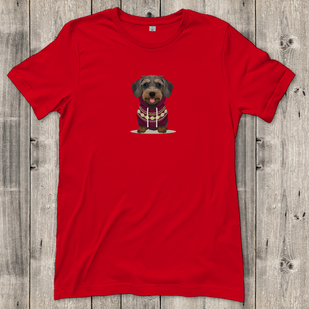 Damen T-Shirt mit Rauhaardackel als Fashion Ambassador im Norweger Pulli