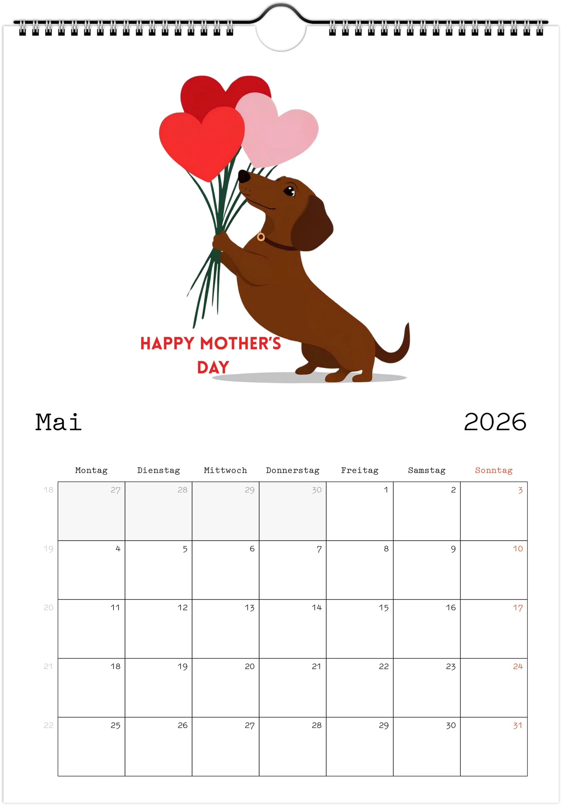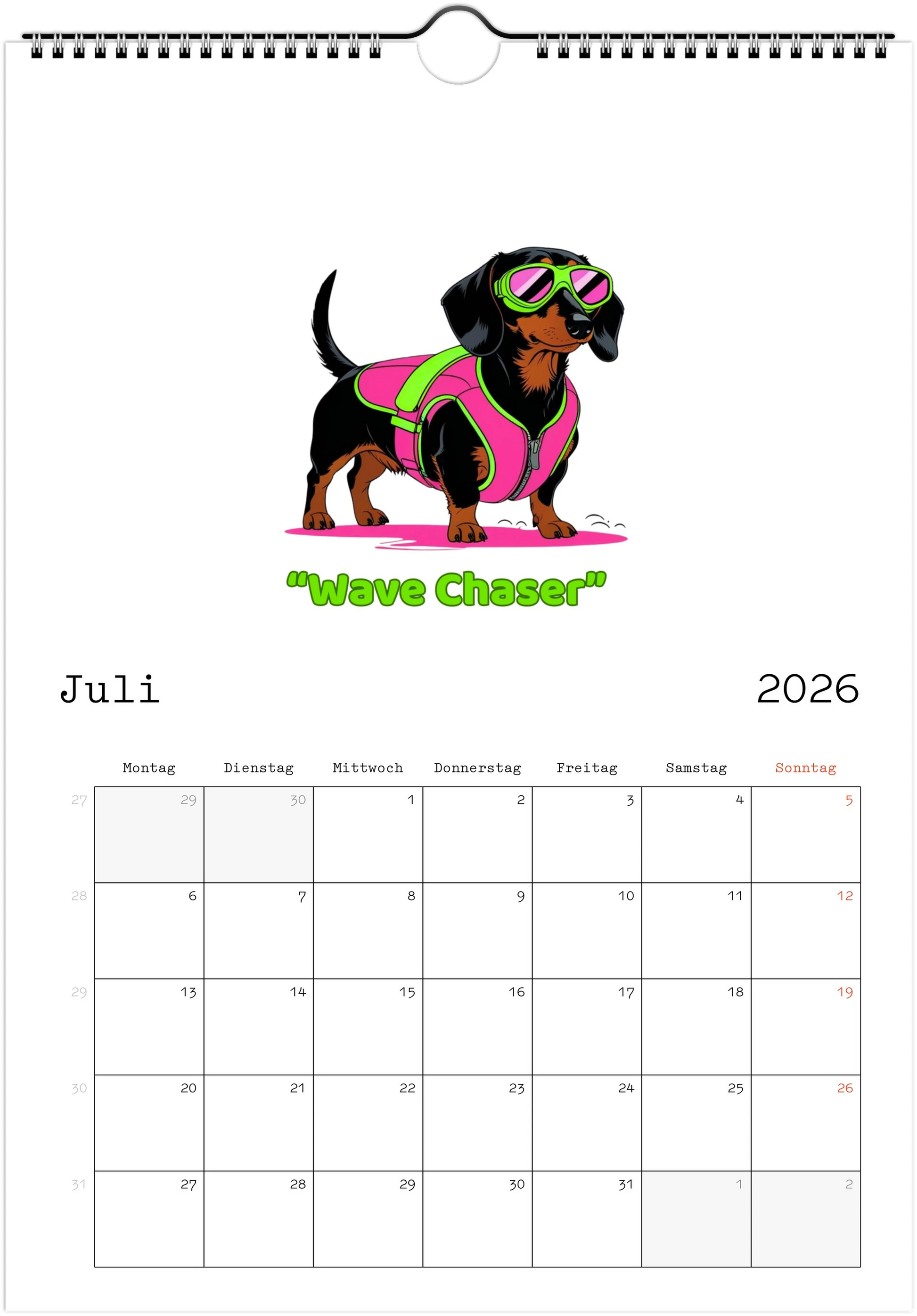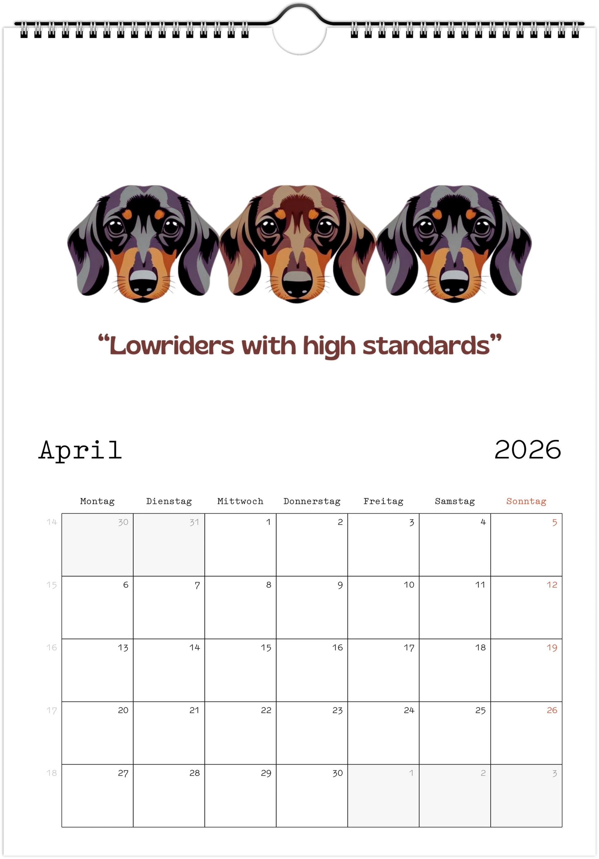 Bringen Sie Freude in Ihr Zuhause mit unserem Dackelmomente-Wandkalender für das Jahr 2026, der bezaubernde und künstlerische Dackel-Motive zeigt – liebevoll gestaltet vom Glam Art Shop, Ihrem Online-Shop für einzigartige Dackel-Shirts und besondere Geschenkideen für Dackel Lovers.